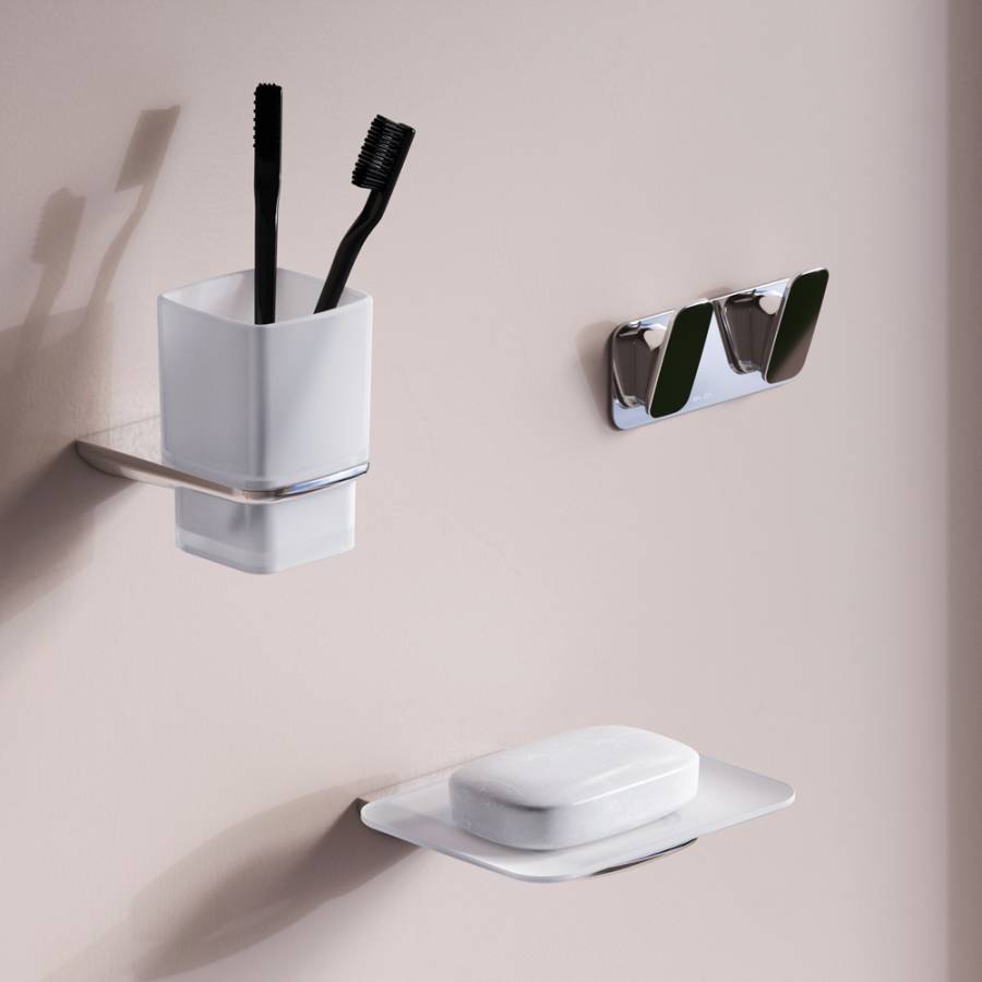 Занимая минимум места в пространстве аксессуары Inspire V2.0 помогут рационально организовать место для хранения и станут стильными акцентами в интерьере. В комплекте: стеклянная мыльница стеклянный стакан двойной крючок для полотенец._x000D_