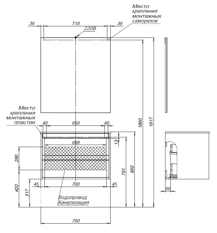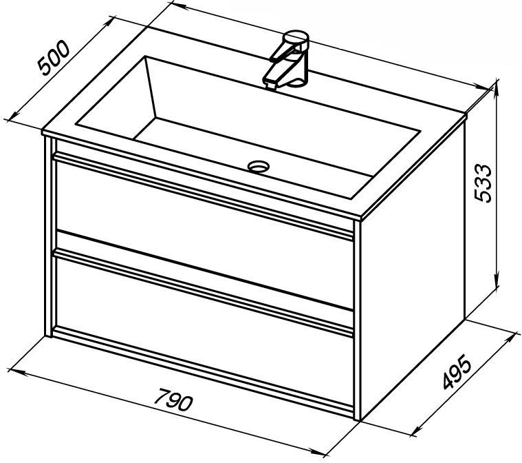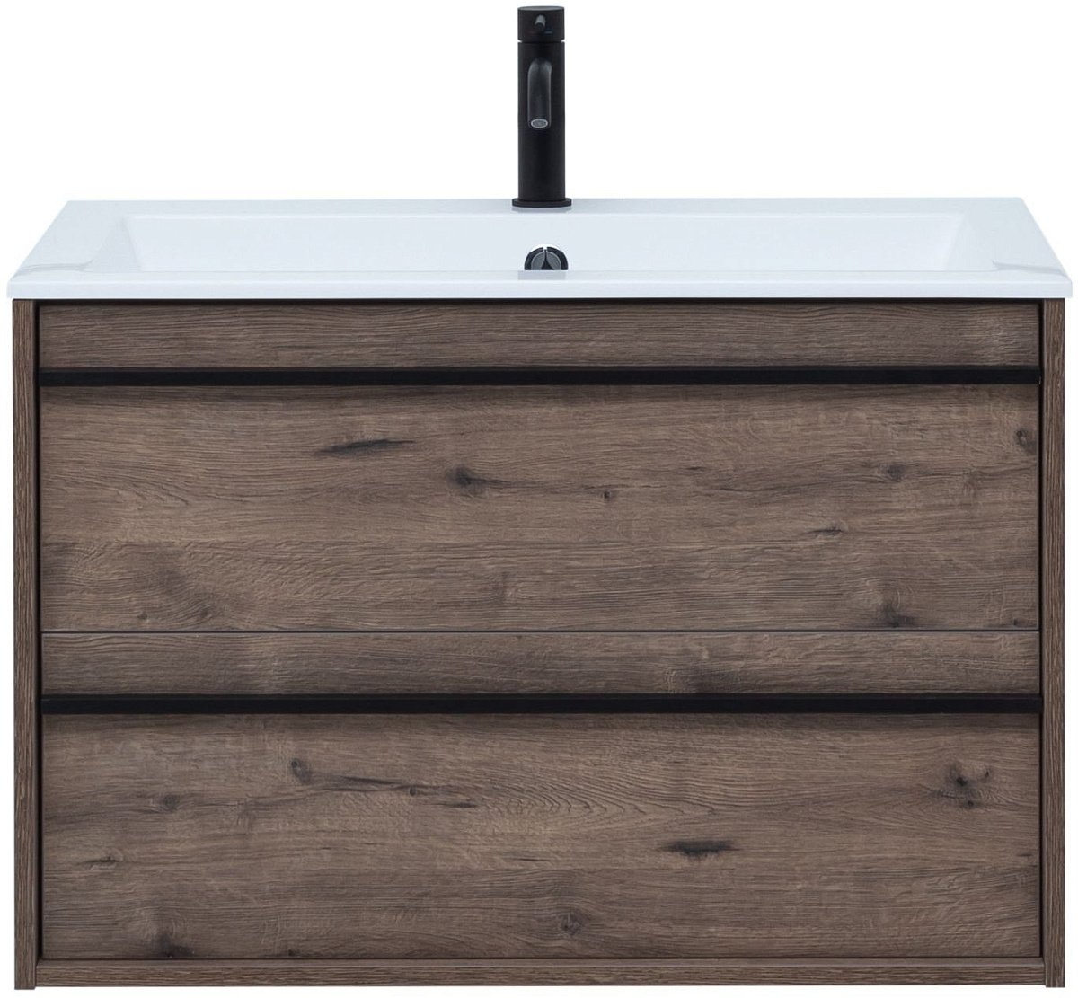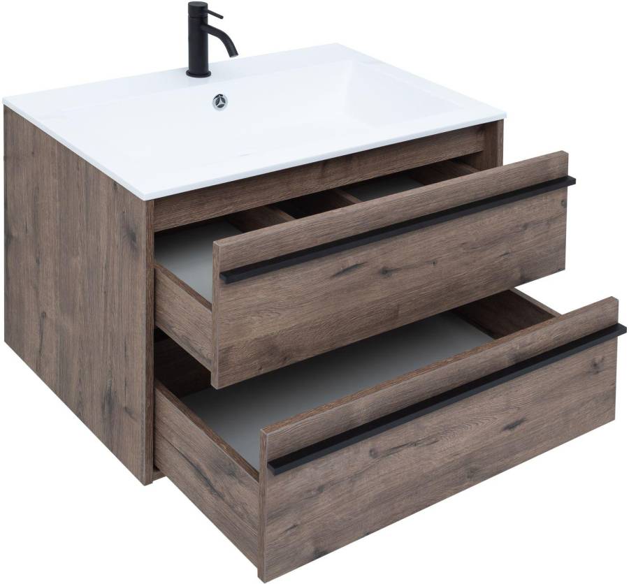 У нее удобная зона хранения: два выдвижных ящика, оборудованных доводчиками, словно утоплены внутрь корпуса. Тонкие изящные ручки во всю ширину ящиков. Именно они находятся в одной плоскости с боковыми стенками. Выглядит стильно. К тому же, безопасно, так как нет выступающих деталей. Кстати, ручки отечественного производства. Сделаны из алюминия, чтобы исключить возможность коррозии, по заказу Aquanet специально для этой коллекции. Сверху на них нанесено эмалевое покрытие. Корпус и фасады тумбы шириной 80 см – из влагостойкого ЛДСП.