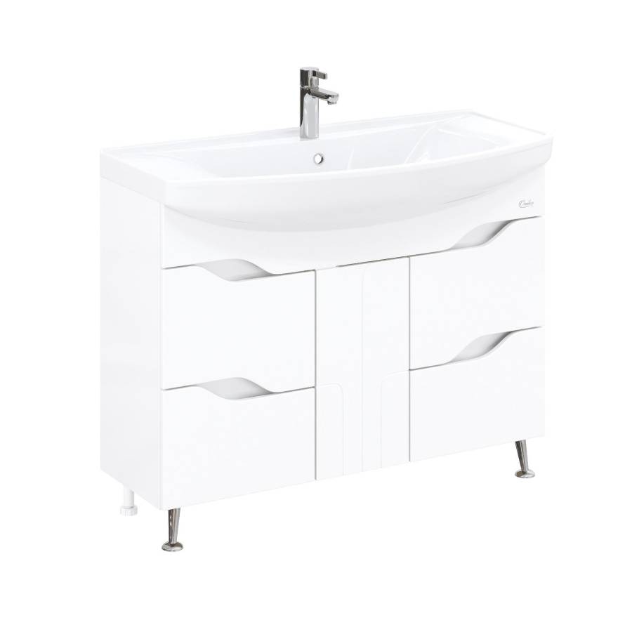 Четыре вместительных выдвижных ящика, снабженные направляющими полного выдвижения, помогут организовать пространство в ванной комнате и компактно разместить необходимые вещи, а распашная дверь посередине, украшенная фрезеровкой и оснащенная системой открывания push-to-open, скрывает дополнительное место для хранения.