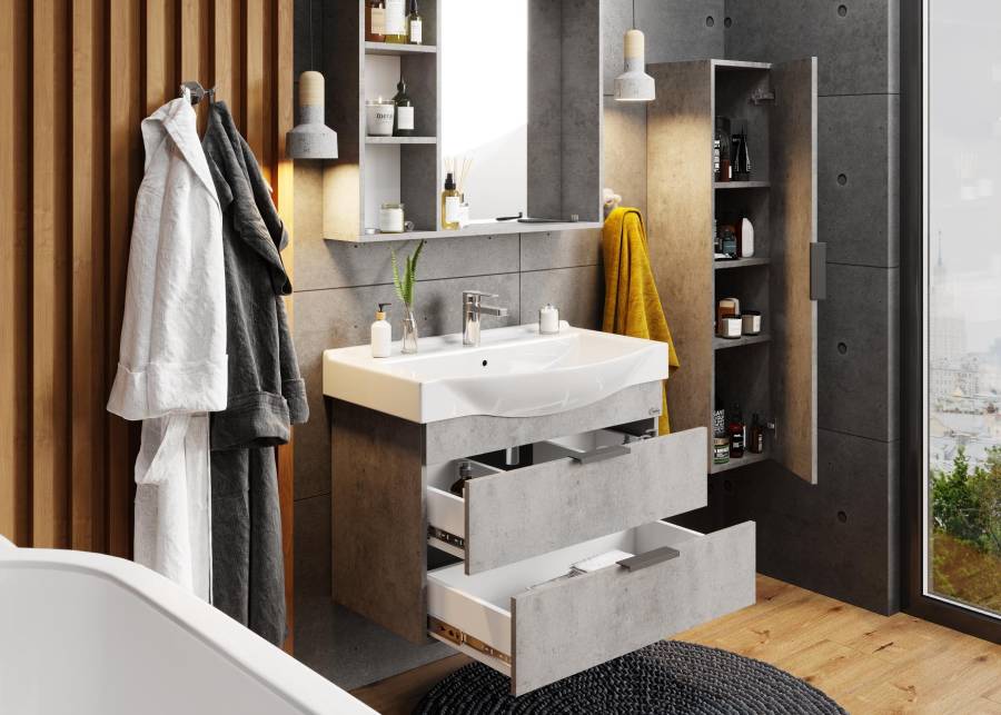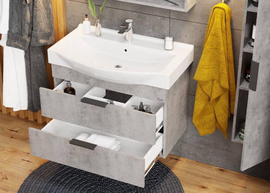 Тумба имеет два ящика с направляющими скрытого монтажа с доводчиками, оснащенные черными матовыми металлическими ручками. Нижний предназначен для больших предметов, а верхний, имеющий удобную систему организации пространства, - для мелких аксессуаров.