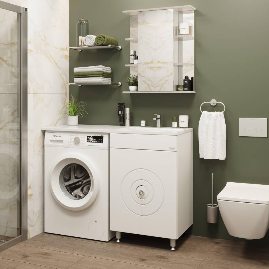 Фасад украшают 2 распашных фигурных двери, украшенные изящной фрезеровкой и снабженные системой плавного закрывания, за ними - большое пространство для хранения банных принадлежностей или бытовой химии, разделенное горизонтальной полочкой.