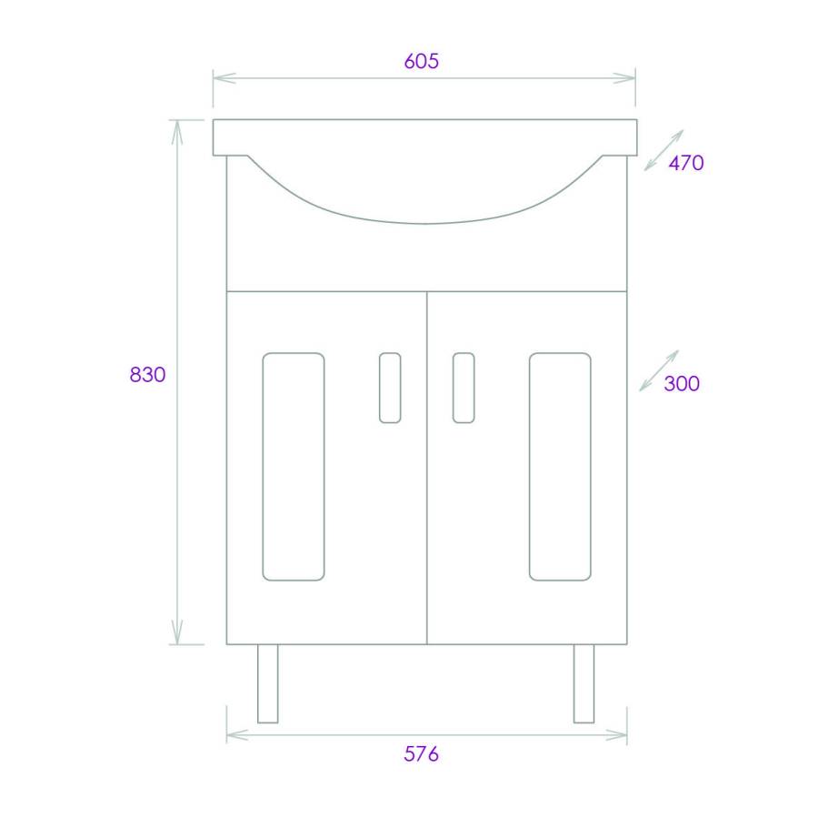 Размеры тумбы без учета раковины и ножек: 58x30x68 см.