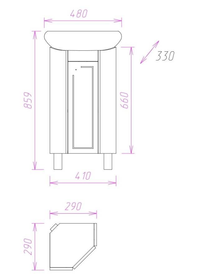 Размеры тумбы без учета раковины и ножек 41х28х66 см.