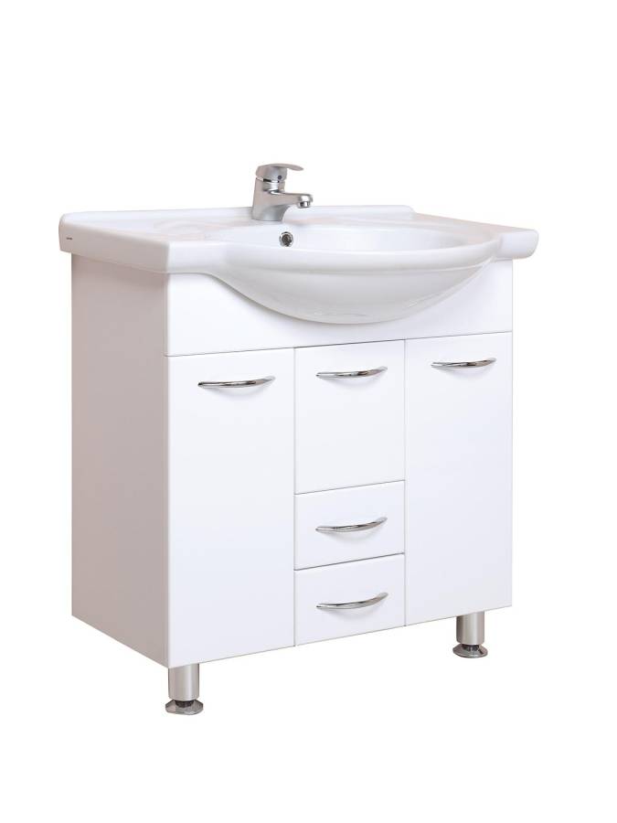 Пять хромированных ручек и четыре ножки (2 декоративных хромированных и 2 пластиковых) идут в комплекте с тумбой.