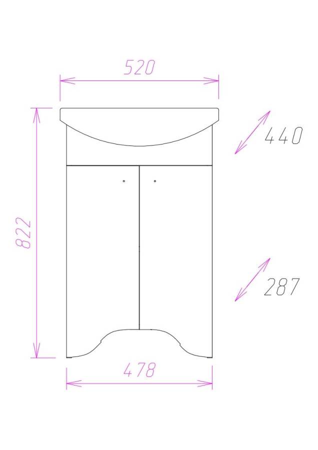 Тумба максимально удобна в использовании: две распашные дверцы скрывают пространство для хранения, разделенное горизонтальной полкой и позволяющее компактно разместить бытовые принадлежности.