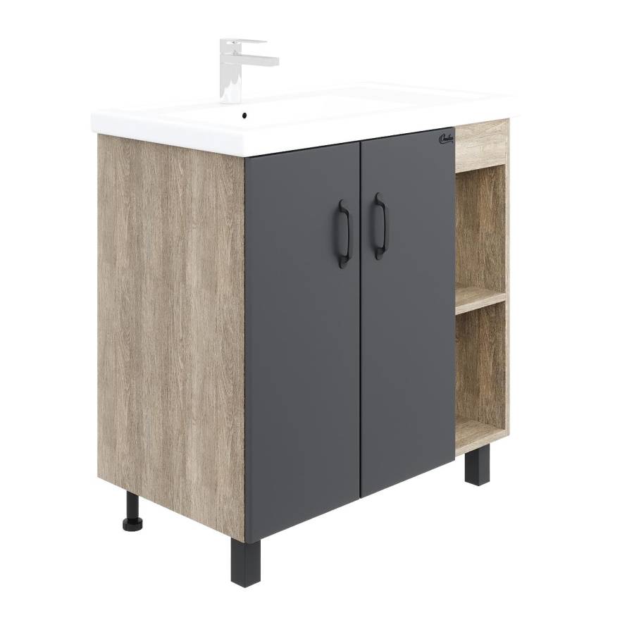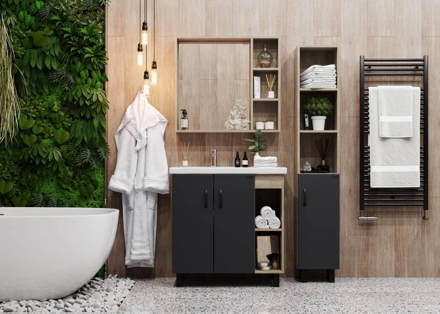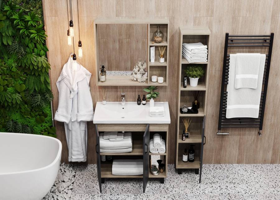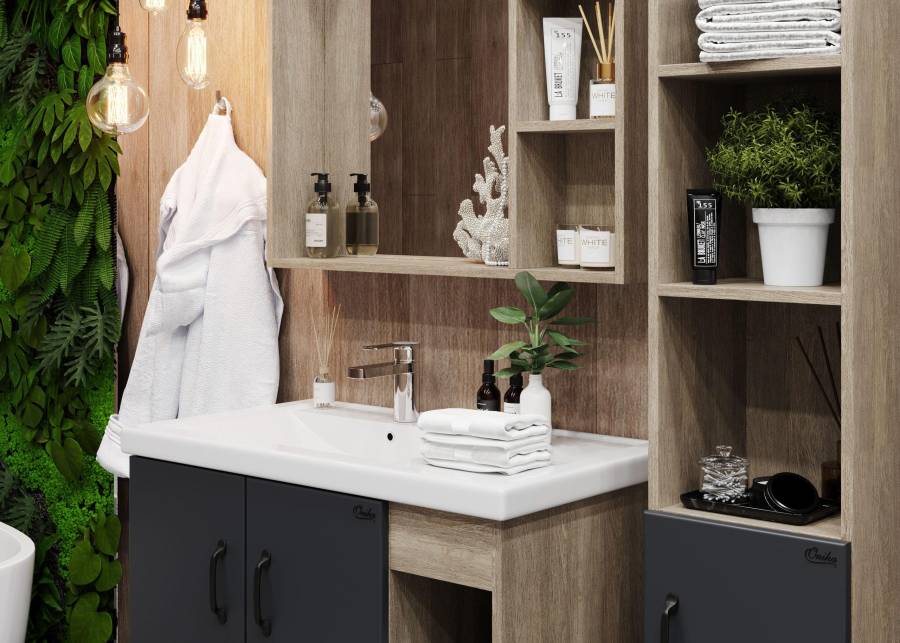 Открытые полки справа обеспечивают быстрый доступ к часто используемым аксессуарам, а пространство за распашными дверцами слева, снабженными системой плавного закрывания, станет удобным местом для хранения различных бытовых принадлежностей.