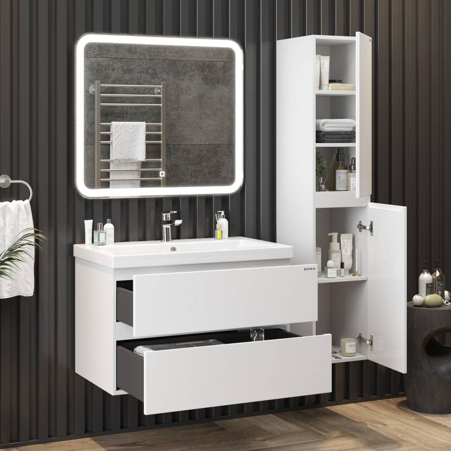 Тумба выполнена из ЛМДФ и ЛДСП, покрытых эмалью, устойчивой к механическим воздействиям, перепадам температур и высокой влажности.