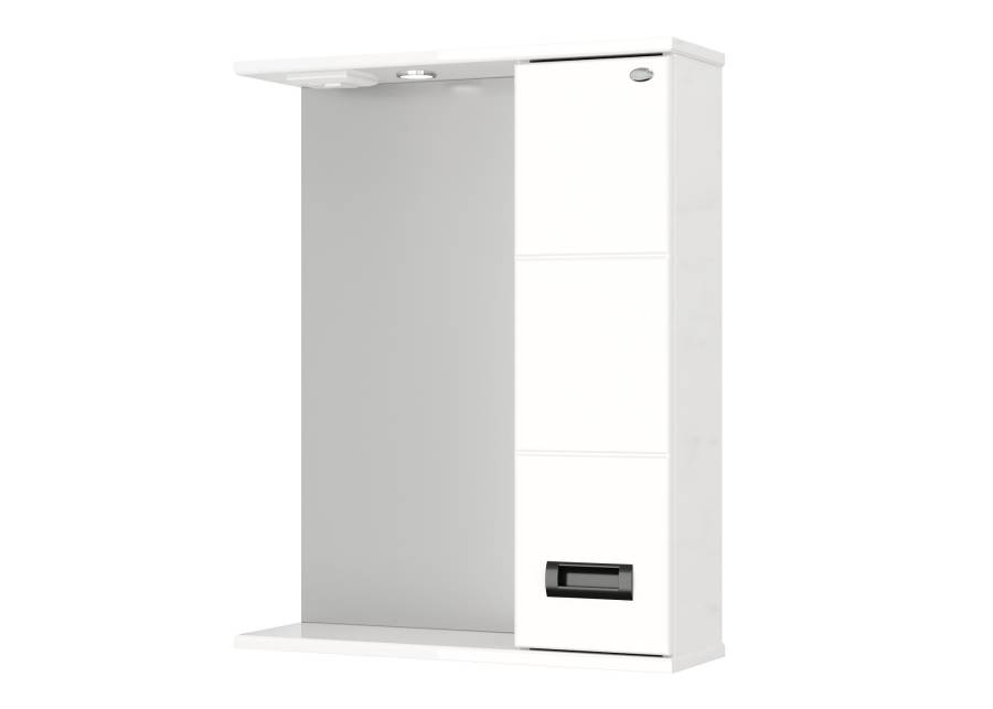 Справа от зеркала за распашной дверцей с механизмом плавного закрывания расположено отделение для хранения, разделенное на две части горизонтальной полочкой, под зеркалом - открытая полочка для косметических средств или декоративных элементов.
