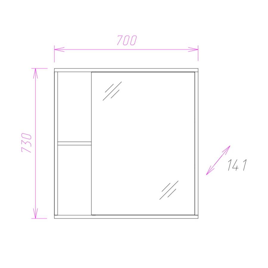 Шкаф максимально удобен в использовании: пространство за зеркальной дверцей с механизмом плавного закрывания, разделенное двумя горизонтальными полочками, позволяет компактно разместить бытовые принадлежности. 2 открытые полочки созданы специально для хранения часто используемых вещей.