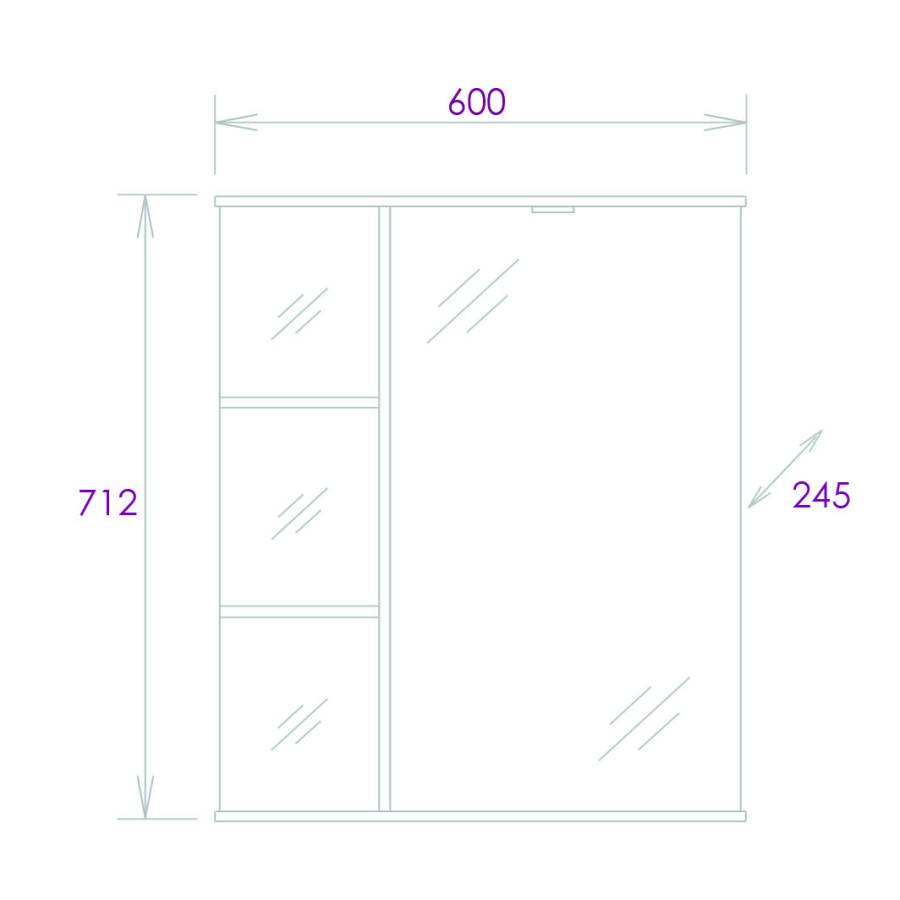 Открытые полочки слева обеспечивают быстрый доступ к часто используемым аксессуарам, а пространство за распашной зеркальной дверцей с механизмом плавного закрывания, разделенное двумя полочками, станет удобным местом для хранения различных бытовых принадлежностей.