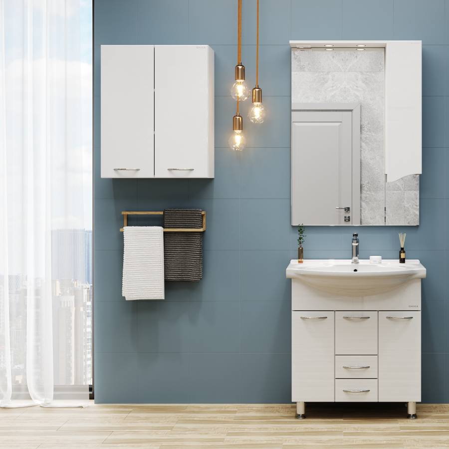 Корпус шкафа влагостойкий, выполнен из ЛДСП, фасад - из МДФ в пленке, устойчивых к механическим воздействиям, перепадам температур и высокой влажности.