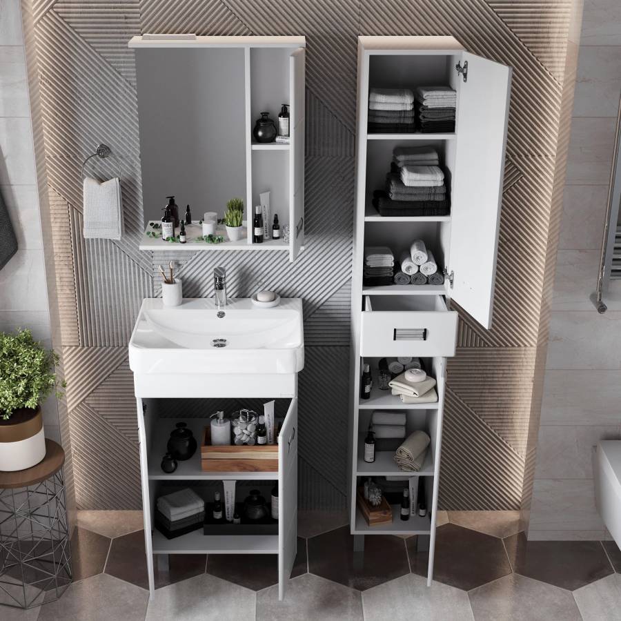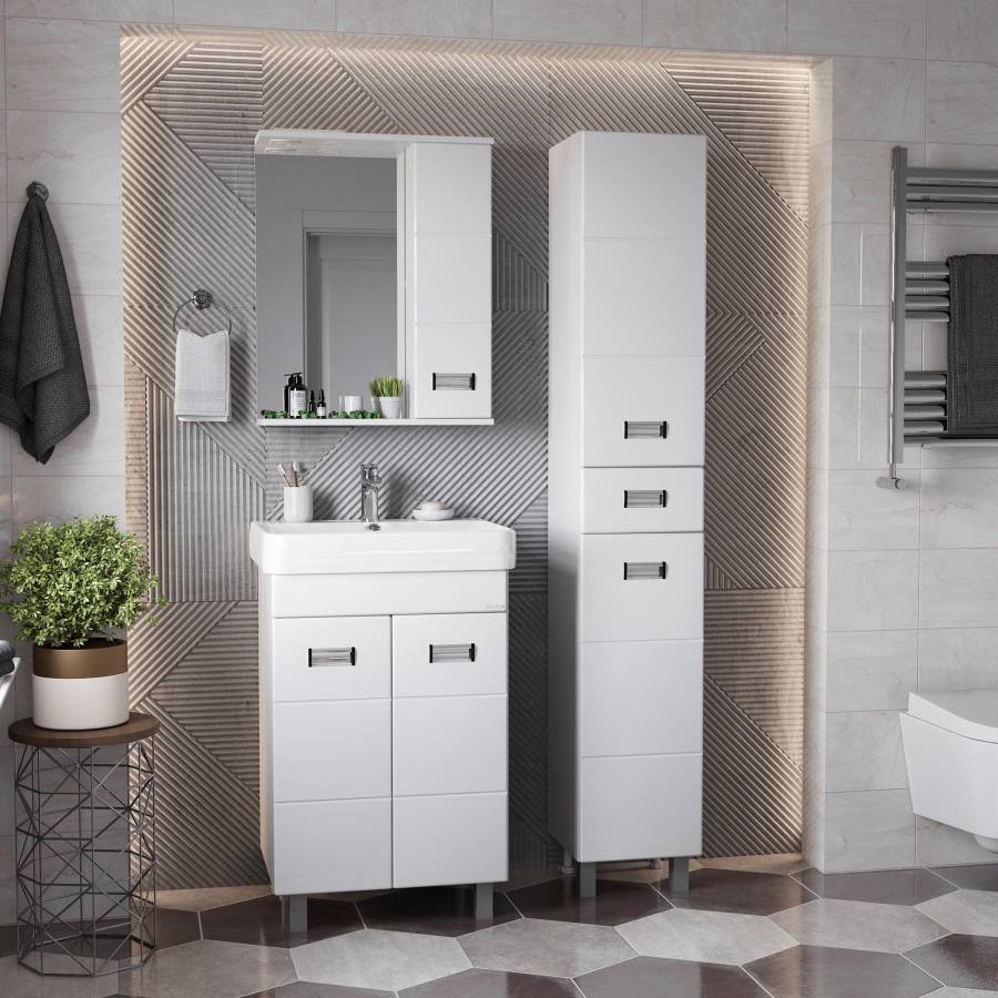 Глянцевый белый цвет фасада, ненавязчивая горизонтальная фрезеровка, врезные хромированные ручки и аккуратная лаконичность - все это позволяет коллекции Балтика стать центральным звеном интерьера ванной комнаты.
