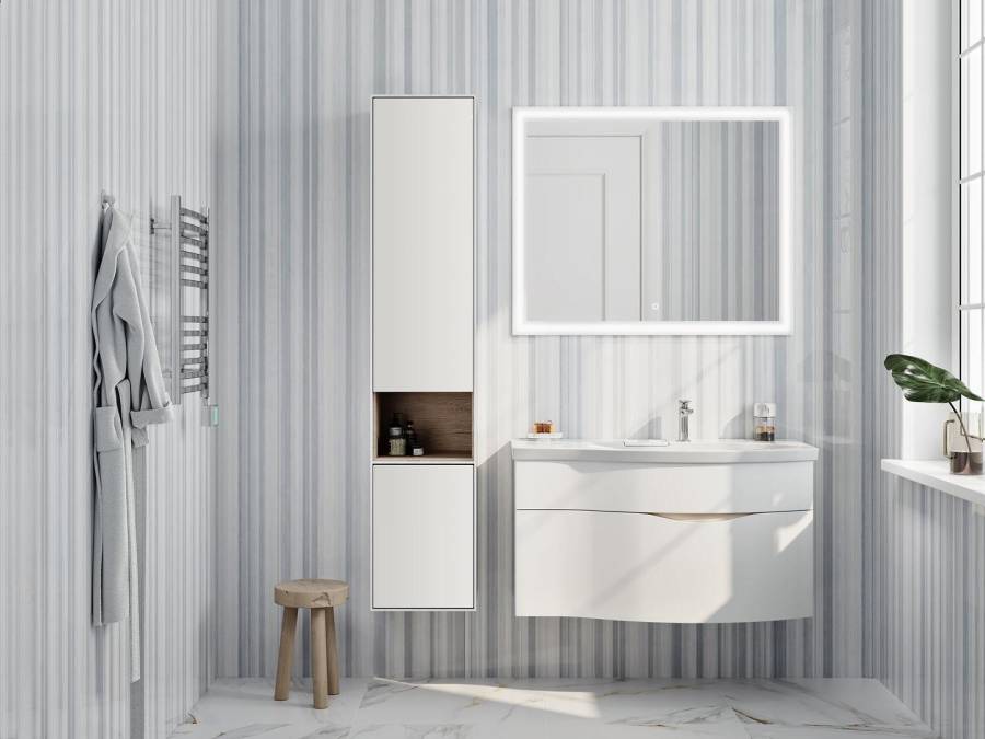 Белая матовая тумба с гнутым фасадом с правым расположением овальной зоны, ширина 100 см. Внутренняя планка окрашена в песочный цвет. Тумба представлена в версии с двумя ящиками, снабжена врезными удобными ручками, которые образуют на фасаде изящную «улыбку». Благодаря смещенному сливу раковины, верхний ящик не имеет вырез под сифон. Сочетается с раковиной RIVA с правым расположением чаши.