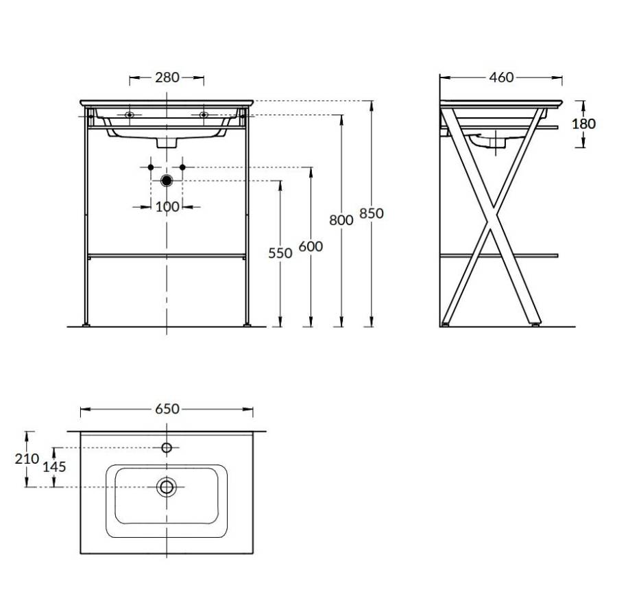 Из металла, окрашенного в чёрный матовый цвет, выполнены две крестообразные ножки, нижняя полка для мелочей и верхняя рама: она служит элементом опоры раковины и одновременно держателем для полотенец. В комплект также входят четыре регулируемых подпятника для более точной установки.