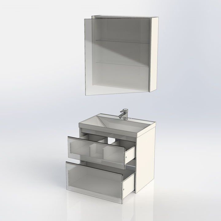 Производители позаботились о деталях. Ящики лишены выступающих деталей, ручки интегрированы в фасад. Тумбу можно из подвесного элемента преобразовать в напольный, просто докупив универсальные ножки. Раковина из литьевого мрамора «Орлеан» относится к числу накладных моделей и внешне выглядит как единое целое с тумбой. Ящики тумб оснащены направляющими Hettich Quadro c плавным закрыванием, более известным нам как доводчик.