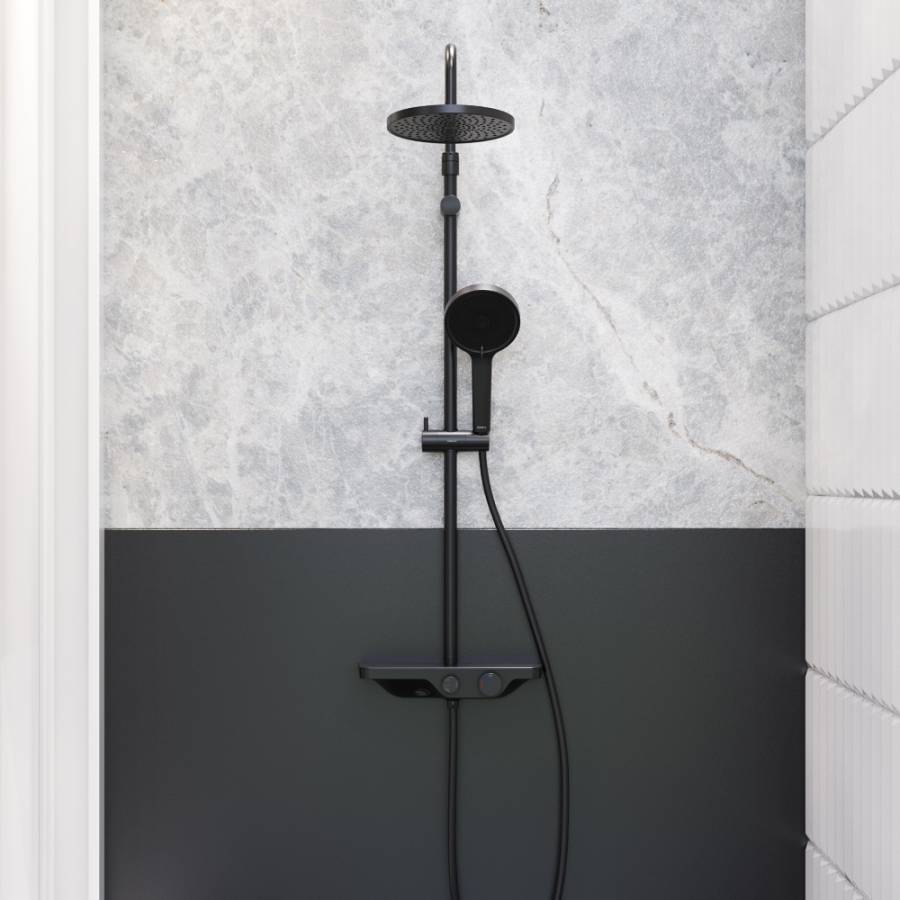 Глубокий матовый цвет дополнен покрытием High Gloss которое уберегает поверхность душевой системы от мелких повреждений. Поддерживать чистоту стало еще проще благоДаря функции очистки резиновых форсунок Rub&Clean.
