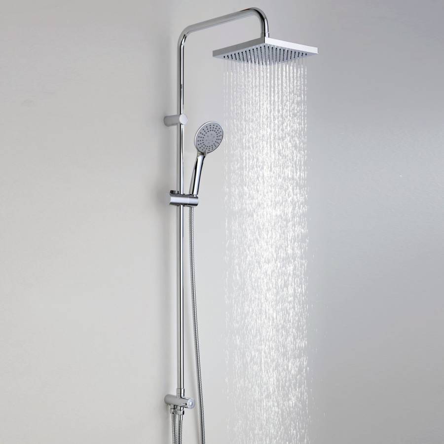 Душевая насадка 200х200 мм, 144 форсунки, ABS-пластик, Стойка для душа, 20мм, Лейка 3-функциональная с системой защиты от известковых отложений, Шланг металлический 1500 мм, подключение к лейке, Шланг металлический 600 мм, подключение к смесителю, Керамический поворотный переключатель, Регулируемый держатель лейки, Набор для монтажа |