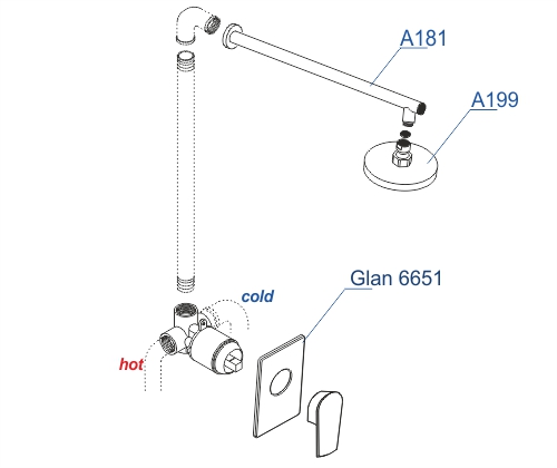 Смеситель для душа Glan 6651, Верхняя душевая насадка A199, Настенный верхний излив для душа A181 |