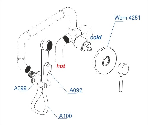 Смеситель для душа Wern 4251, Подключение шланга A099, Шланг для душа 1500 мм А100, Гигиеническая лейка с фиксатором A092 |
