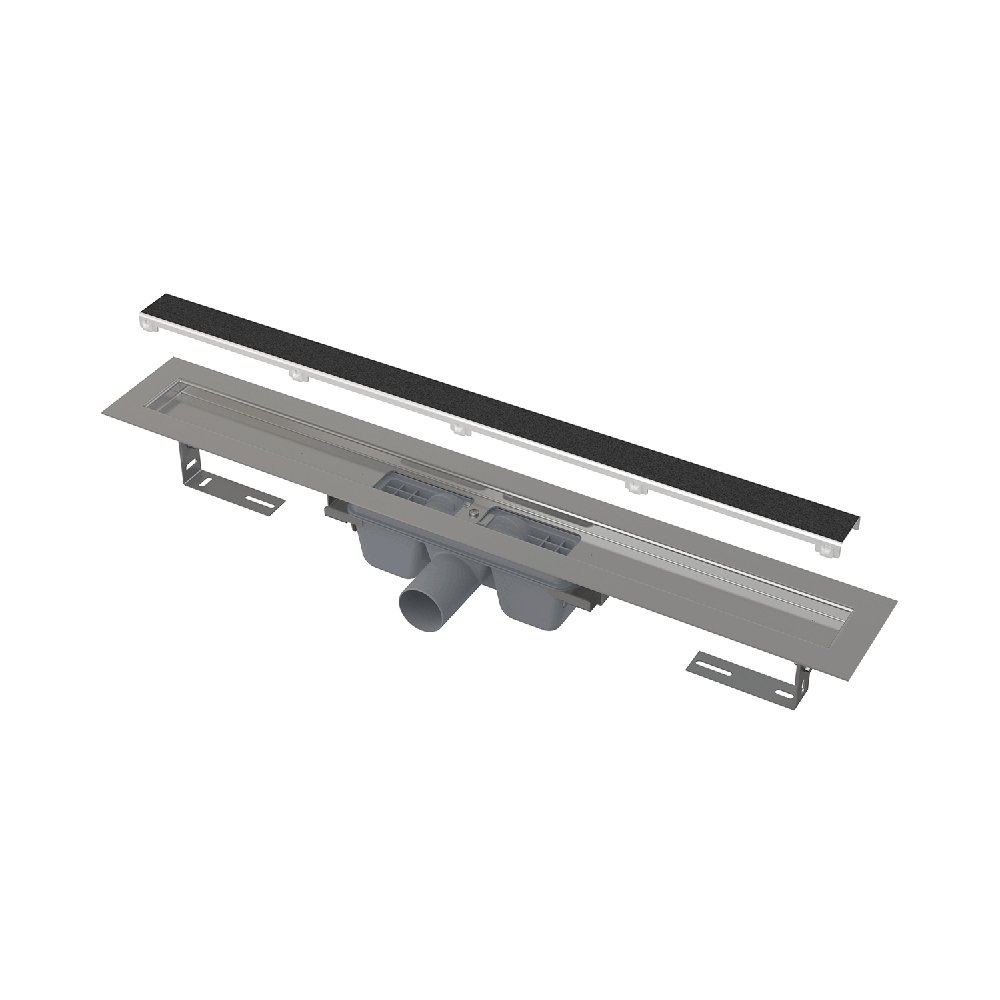 Водоотводящий желоб с сифоном; Решетка для наклеивания различных типов напольных покрытий; шаблон для резки плитки на решетку; Монтажный комплект: шуруп Ø6×50 – 2 шт., дюбель Ø10 – 2 шт.; Самоклеящиеся гидроизоляционные ленты; Защитная пленка для воротника; Защитная пленка на вход в сифон; Монтажная крышка желоба - полистирол; Крюк для демонтажа. |