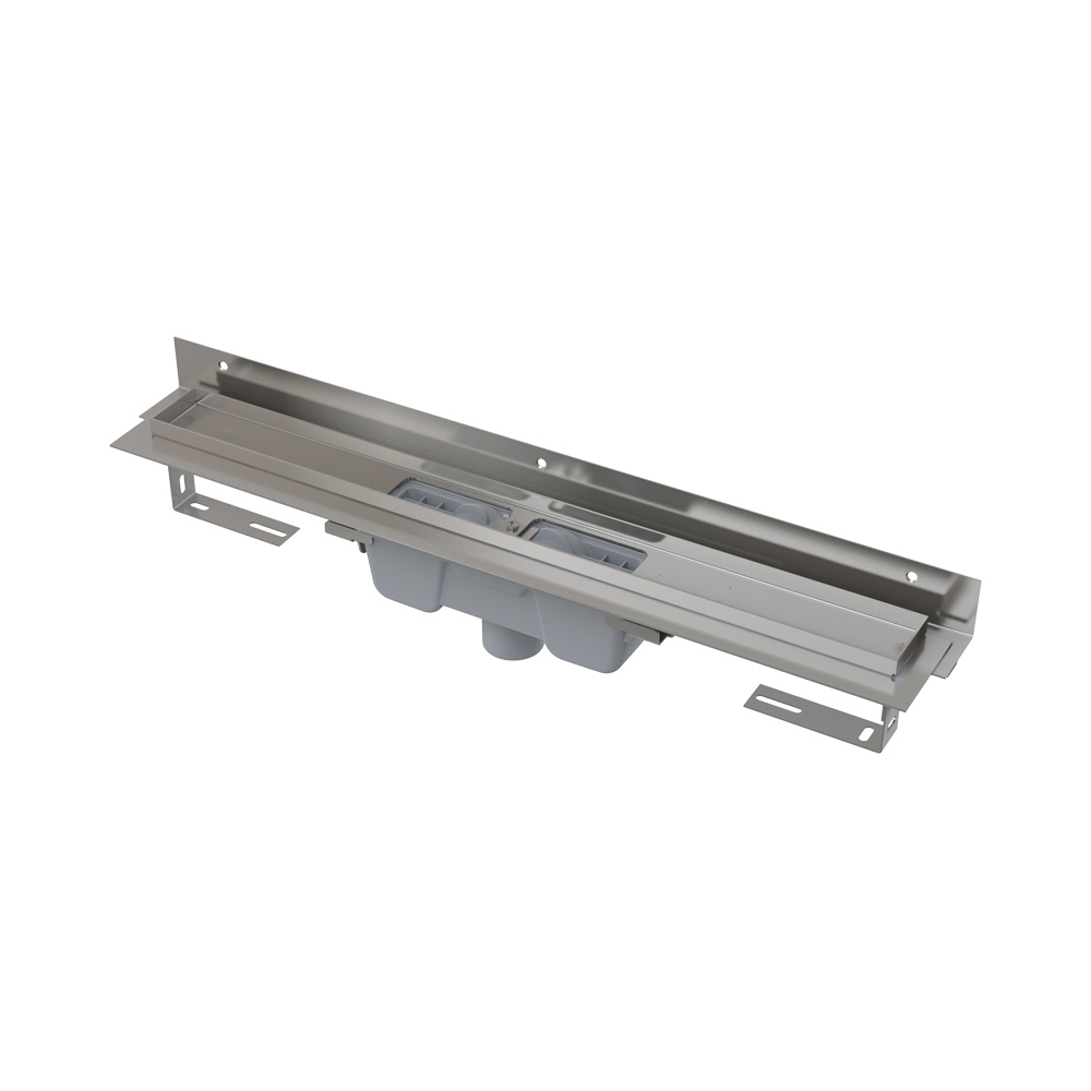 Водоотводящий желоб с сифоном Монтажный набор: шуруп Ø6×50 – 2 шт., дюбель Ø10 – 2 шт., шуруп Ø4,2×38 – 2 шт.,дюбель Ø8 – 3 шт. Самоклеящиеся гидроизоляционные ленты Защитная пленка для воротника желоба и впускного отверстия сифона Монтажный вкладыш для защиты лотка желоба Монтажный набор для крепления регулируемых ножек: шуруп M6×12 – 2 шт. |