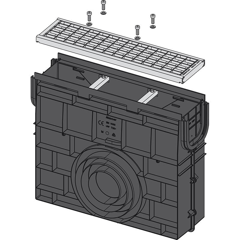 Корпус дренажного канала Оцинкованная решетка – класс нагрузки B125 Болты для крепления решетки в канале – 4 шт. |