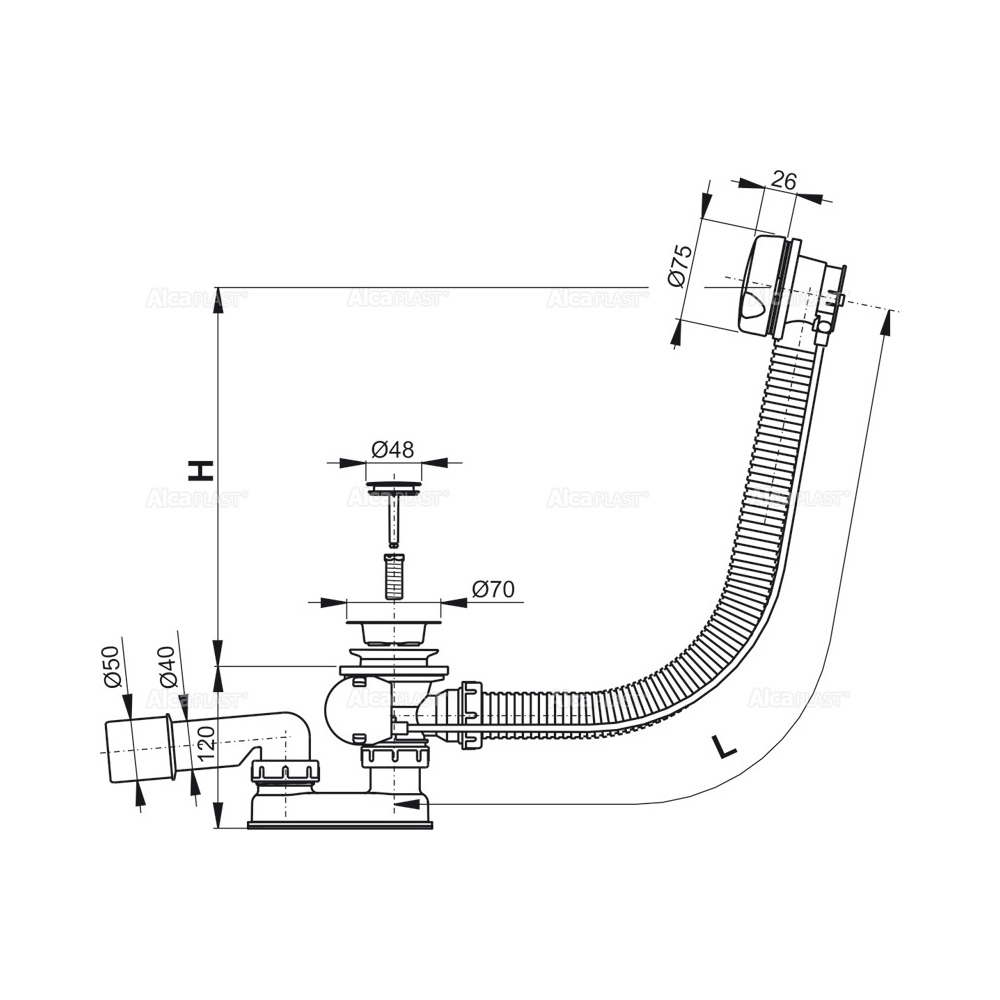 Корпус сифона с системой перелива; Поворотная пластиковая накладка белого цвета; Хромированная стальная пробка; Сливная решетка из нержавеющей стали; Гидрозатвор сифона из полипропилена, сваренный ультразвуковым методом, устойчив к термическим и химическим воздействиям; Монтажный комплект; Профильное уплотнение. |