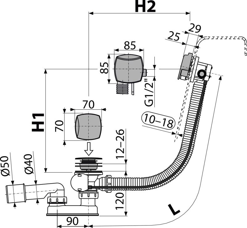 Корпус сифона с системой перелива; Поворотная пластиковая накладка, хромированная; Пробка из хромированного пластика; Хромированная решетка слива из нержавеющей стали; Гидрозатвор сифона из полипропилена, сваренный ультразвуковым методом, устойчив к термическим и химическим воздействиям; Монтажный комплект; Профильное уплотнение. |