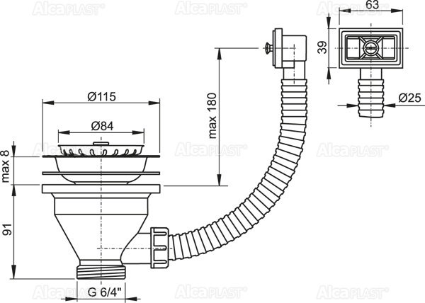 AlcaPlast A38 Выпуск для кухонной мойки (хром). Донный клапан сифона для мойки 6/4" с нержавеющей решеткой DN115 и гофропереливом. Резьбовое соединение 6/4" для подключения к сифону для мойки. Сетка сливного отверстия служит пробкой. Материал: полипропилен. Пробка из нержавеющей стали. Сливная решетка из нержавеющей стали.