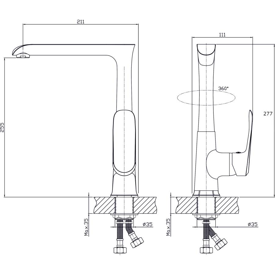 В смеситель установлен картридж D-35 с керамическими пластинами. Высота смесителя 277 мм. Излив поворотный, 211 мм. Высота излива до аэратора 255 мм. Аэратор изготовлен из пластика с нержавеющим корпусом.