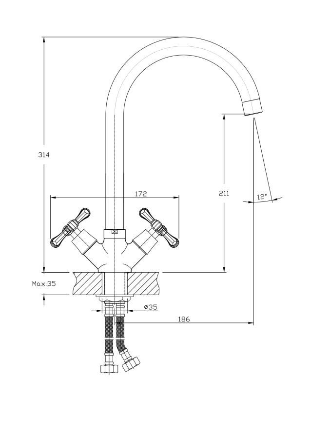 В смеситель установлены кран-буксы (RSH502) с керамическими пластинами. Высота смесителя 314 мм. Излив поворотный 186 мм. Высота излива до аэратора 211 мм. Аэратор изготовлен из пластика с нержавеющим корпусом, угол наклона - 12 гр.