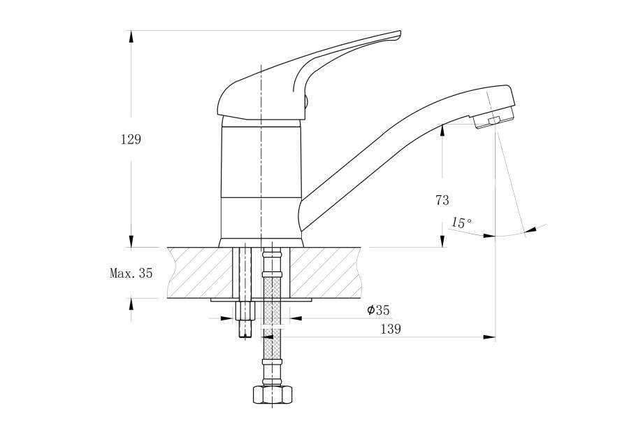 В смеситель установлен картридж D-40 (RSH202) с керамическими пластинами. Высота смесителя 129 мм. Излив литой, неповоротный, 139 мм. Высота излива до аэратора 73 мм. Аэратор изготовлен из пластика с нержавеющим корпусом, угол наклона - 15 гр.