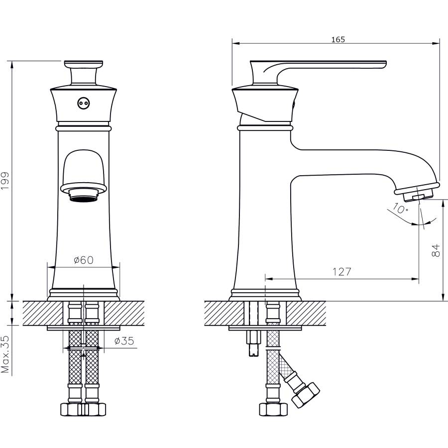 В смеситель установлен картридж D-35 с керамическими пластинами. Высота смесителя 199 мм. Излив литой, неповоротный, 127 мм. Высота излива до аэратора 84 мм. Аэратор изготовлен из пластика с нержавеющим корпусом, угол наклона аэратора- 10 гр.
