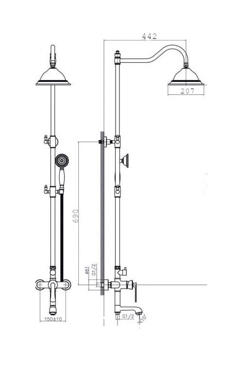 В комплекте 1- режимная душевая лейка, тропический душ, изготовленный из современной прочной пластмассы с никель-хромированным покрытием, душевая штанга, держатель душевой лейки, душевой шланг с латунными гайками 150см, смеситель, индивидуальный пакет, паспорт, гарантийный талон