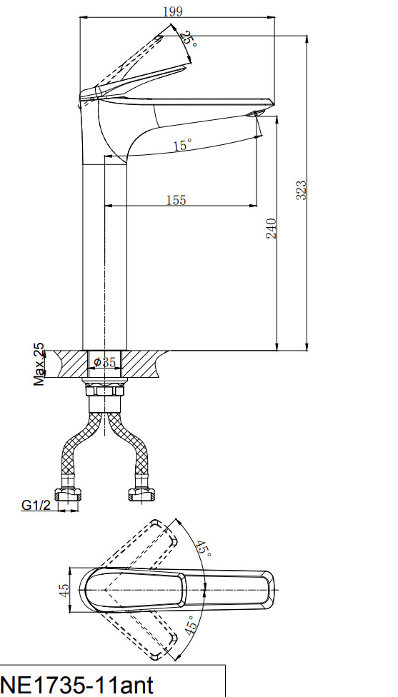 В смеситель установлен картридж D-35 с керамическими пластинами. Высота смесителя 323 мм. Излив литой неповоротный 199 мм. Высота излива до аэратора 240 мм. Аэратор изготовлен из пластика с нержавеющим корпусом, угол наклона - 15 гр.
