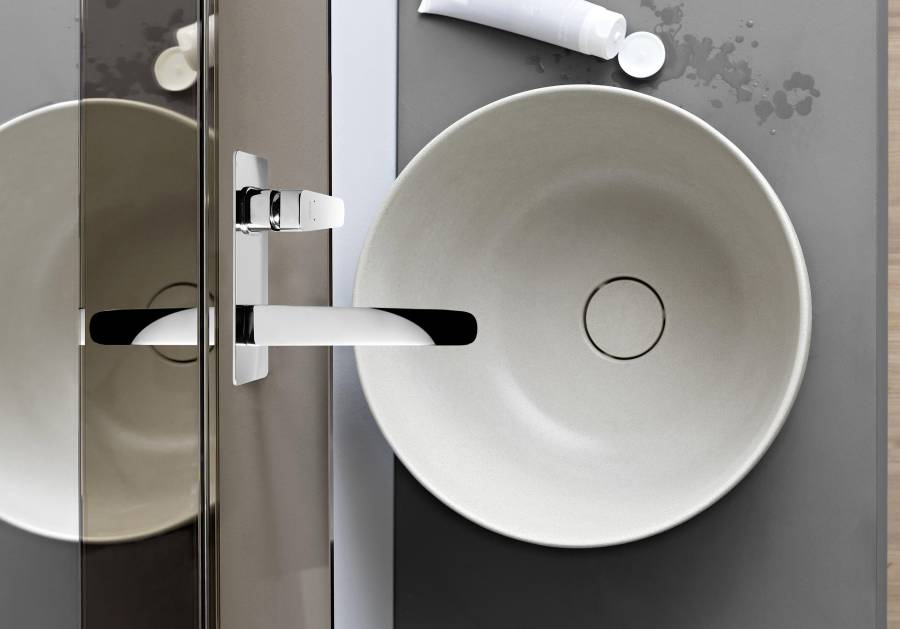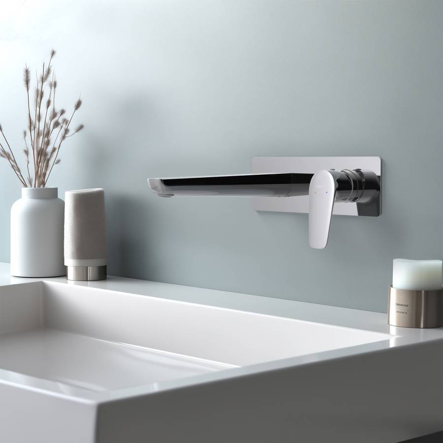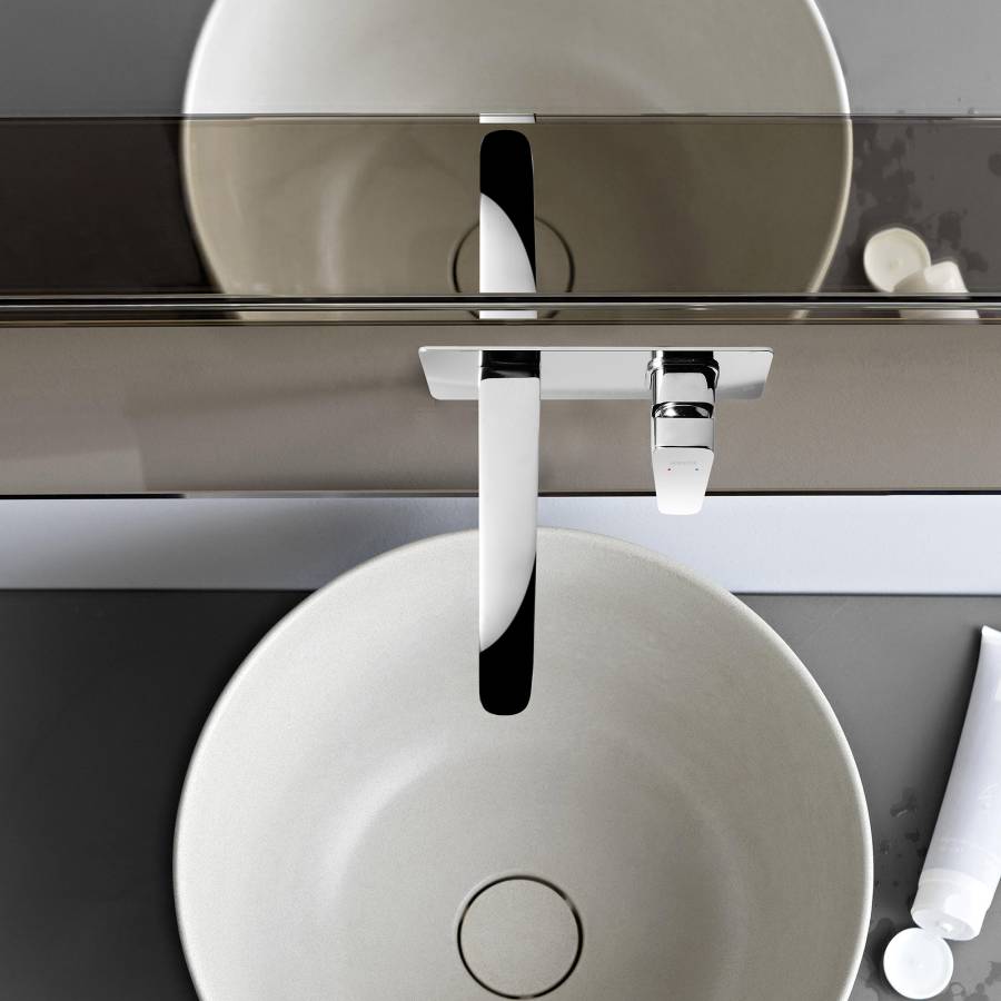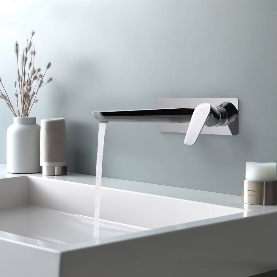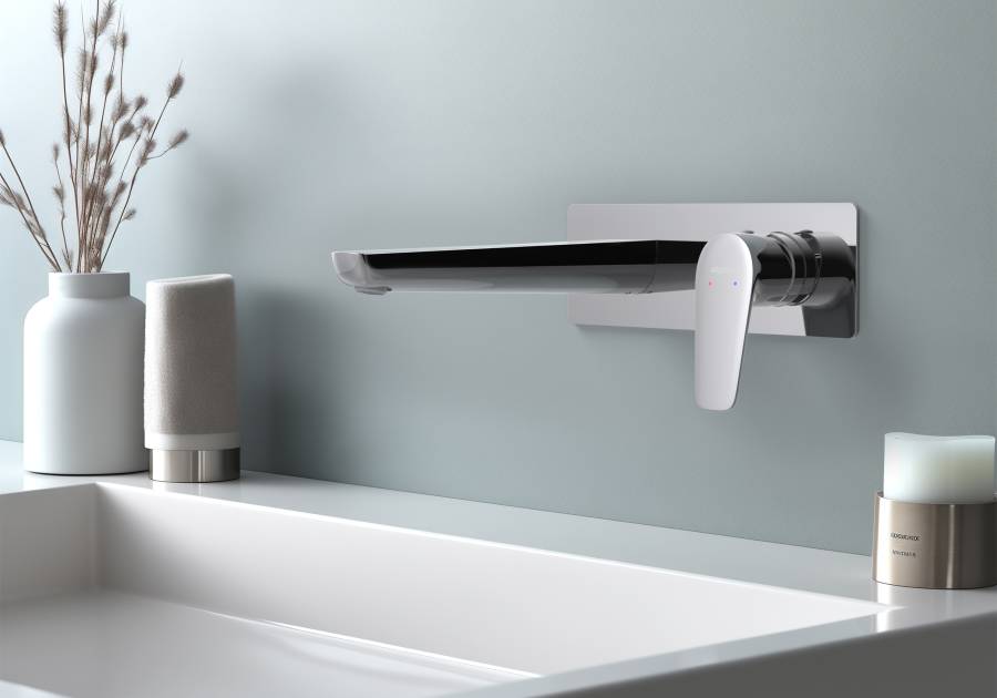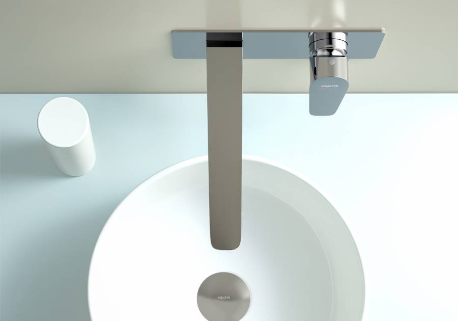1. Смеситель (внешняя и скрытая часть) 2. Декоративная накладка на стену из нержавеющей стали 3 мм 3. Излив смесителя |