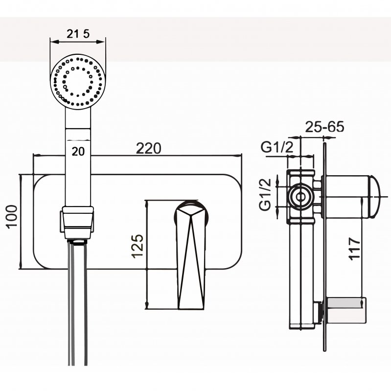 Смеситель (внешняя и внутренняя часть). Гигиенический душ. Душевой шланг. Гибкая подводка G 1/2. Крепежный комплект. |