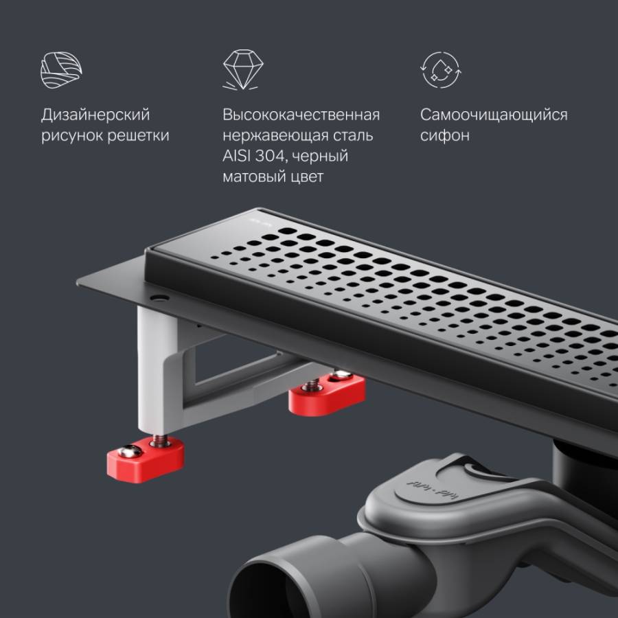 Продукт обладает низкой высотой монтажа и возможностью регулировки что предполагает экономию бюджета при заливке пола. Трап выполнен из высококачественной нержавеющей стали марки AISI 304. Выход разработан на два диаметра: 40 и 50 мм которые выбираются в процессе монтажа._x000D_