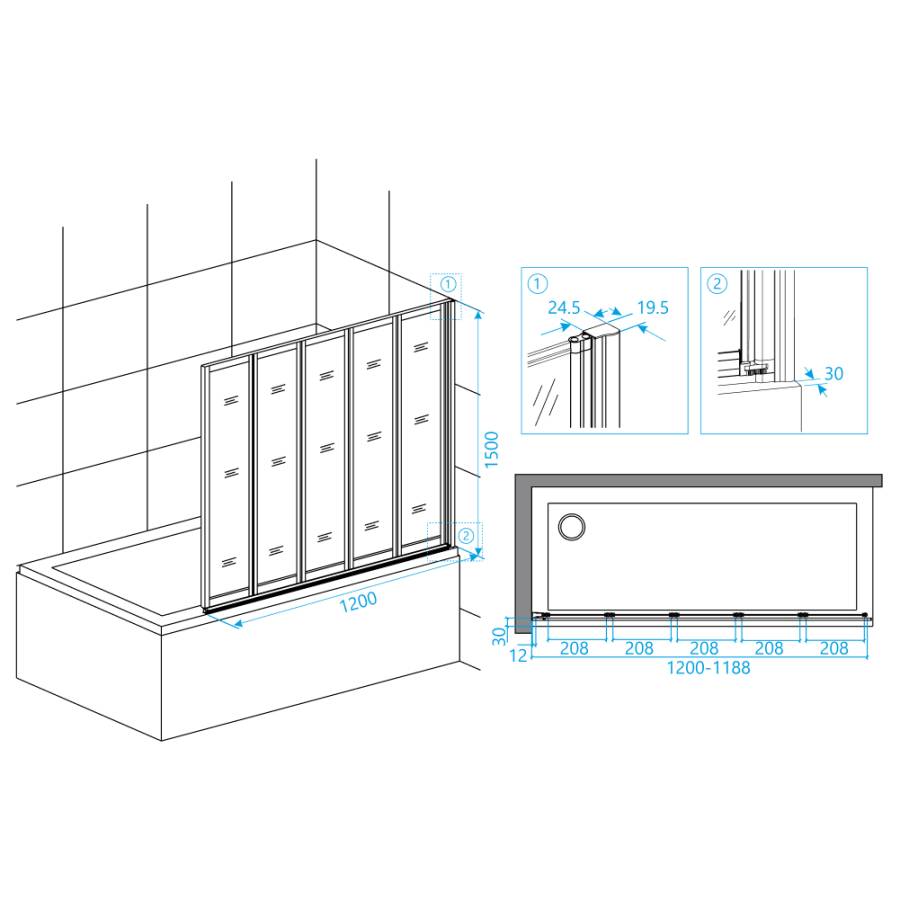 Высота стеклянной шторки составляет 1500 мм, что является оптимальной высотой для использования в ванной комнате. Конструкция шторки складная. Это значит, что она удобно складывается, что позволяет свободно использовать пространство в ванной комнате.