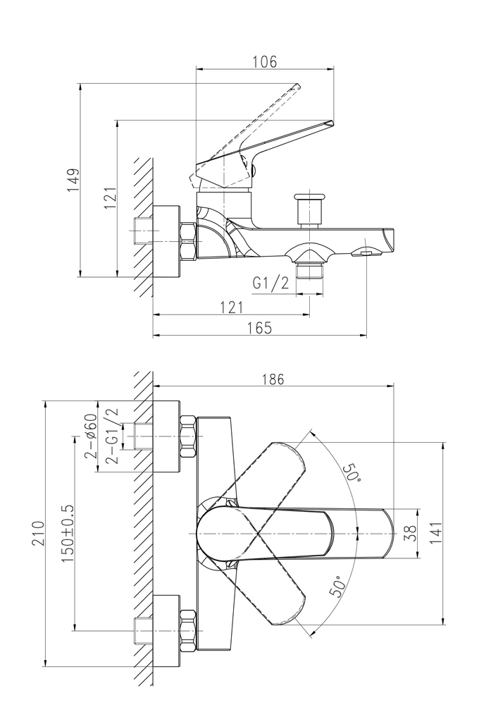 Смеситель для душа, душевой набор (душевая лейка, держатель лейки, душевой шланг); S-образные эксцентрики 65 гр., крепеж. |
